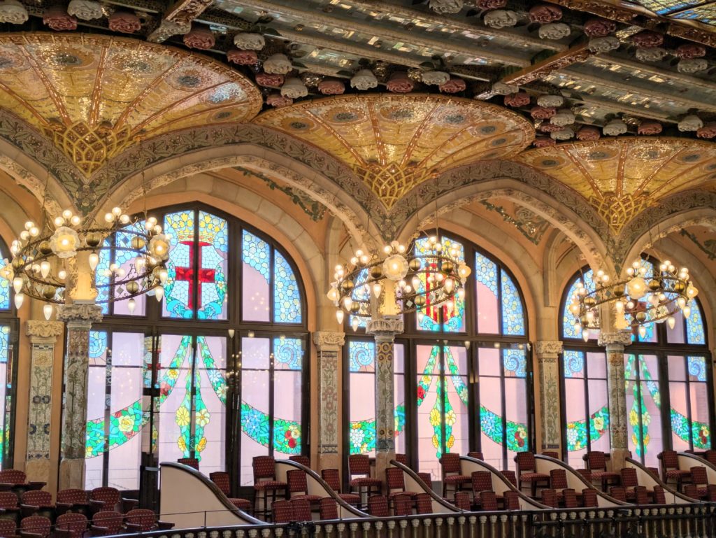 カタルーニャ音楽堂では、モンタネールの手による華やかで繊細な装飾とステンドグラスが、音楽と建築の美しさを融合させた空間として心に残りました。
