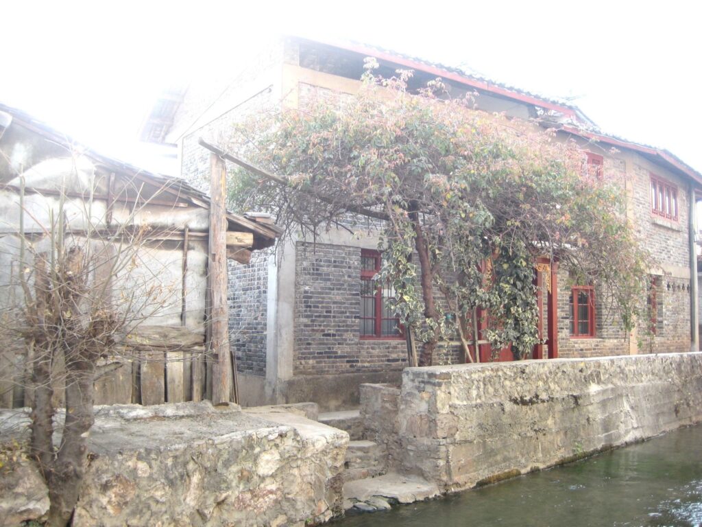 ナシ族の伝統的な四合院を改装した建物で、中庭には木が植えられ、奥には川が流れています。